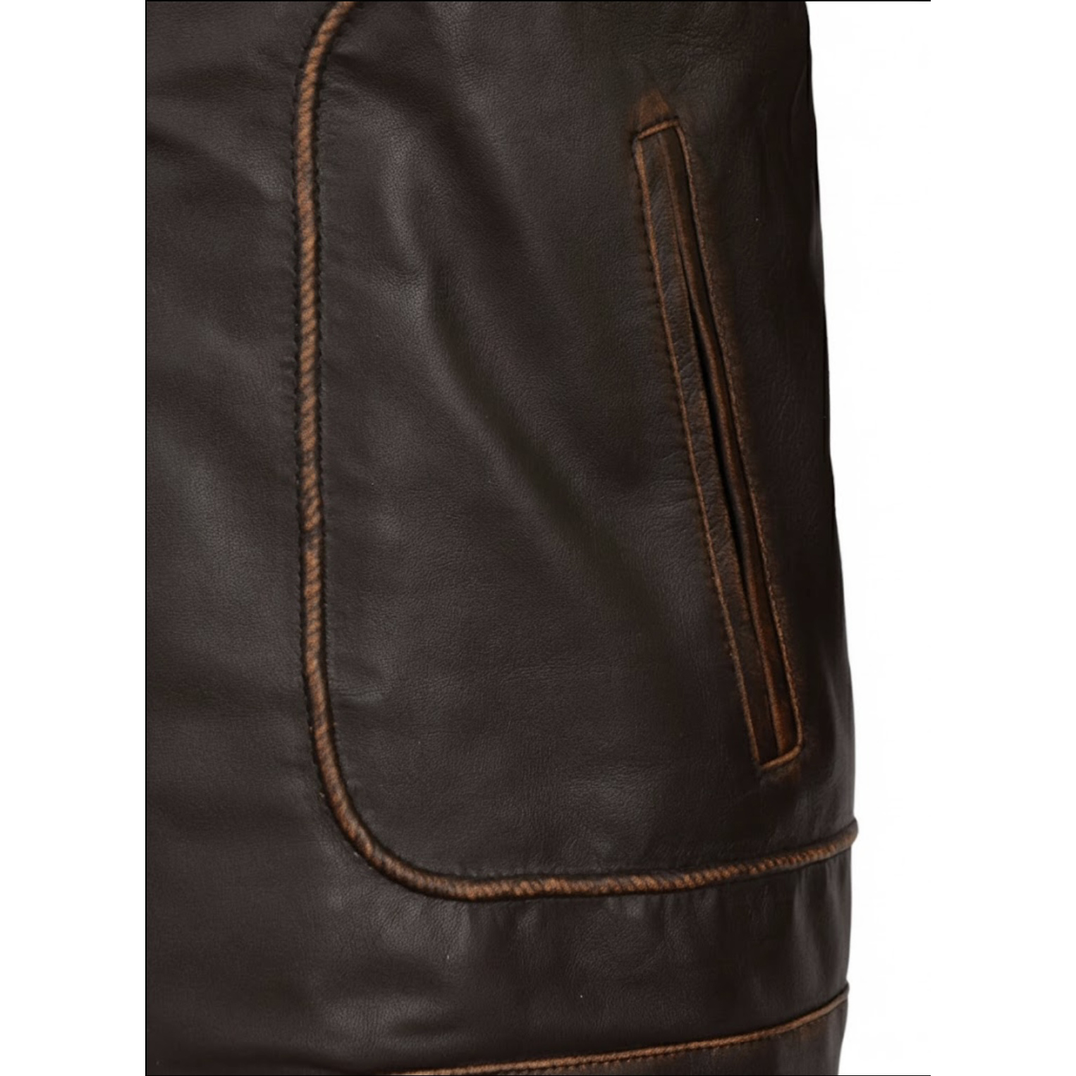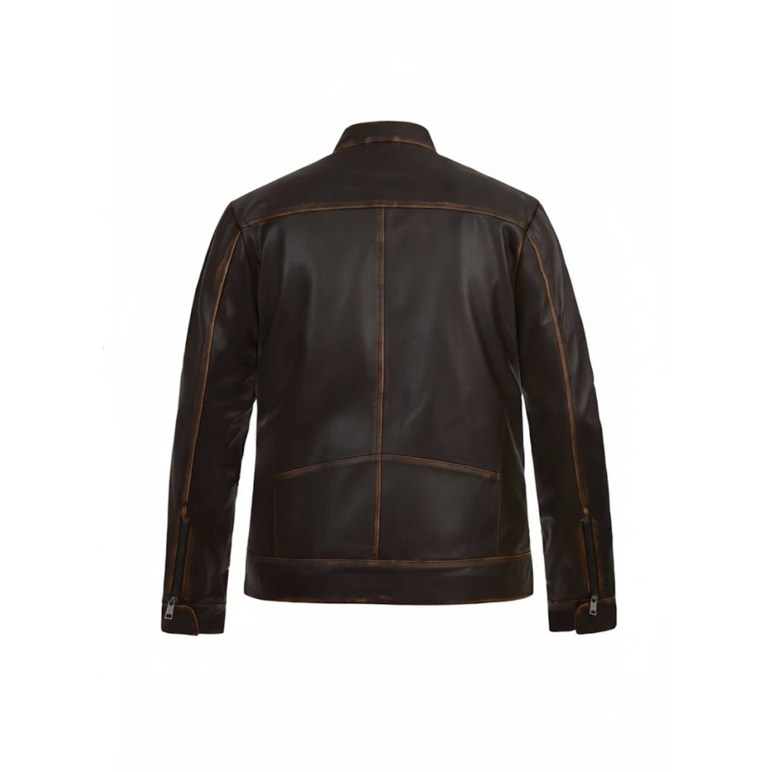 Design a versatile jacket that can be crafted in both leather and rexine, featuring a rich brown colour palette. Incorporate a classic fit, multiple pockets, and adjustable cuffs for added functionality. Consider adding modern details like metal hardware, striking graphics, and a stand-up collar for added style.